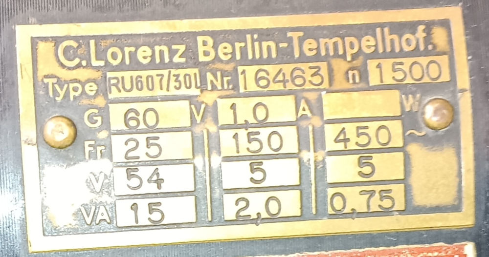 Das zweite rechte Bild zeigt das Typenschild der Maschine. Aus diesem gehen alle technischen Daten der Maschine hervor: Hersteller: Carl-Lorenz-AG Berlin Tempelhof; Antriebsspannung 60 V- bei einer Stromaufnahme von 1 A und einer Geschwindigkeit von 1500 Umdrehungen pro Minute; Rufspannung 54 V~ bei einer Frequenz von 25 Hz und einer Scheinleistung von 15 VA; Hörton 1 mit einer Frequenz von 150 Hz bei einer Spannung von 5 V~ und einer Scheinleistung von 2 VA; Hörton 2 mit einer Frequenz von 450 Hz bei einer Spannung von 5 V~ und einer Scheinleistung von 0,75 VA.