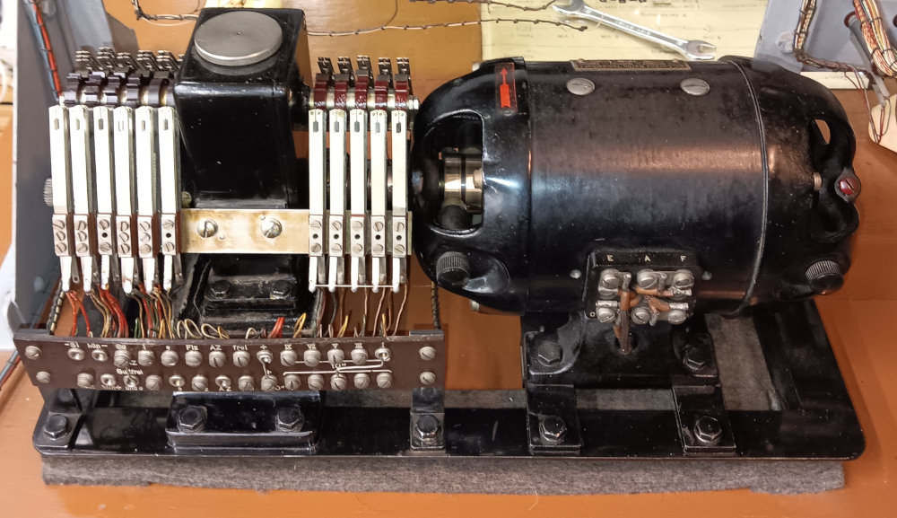 Angetrieben wird die Maschine mit 60 V- , diese wird aus der Amtsbatterie bezogen. Die Rufspannung wird im Anker (Rotor) erzeugt und mittels Kohlen an den Schleifringen abgenommen. Die Schleifringe sind in der Mitte des Bildes zu erkennen. Auf dem Anker befinden sich auch die zwei Tonräder, die in den Hörtonwickungen im Ständer (Gehäuse) die Hörtöne von 150 und 450 Hz erzeugen.